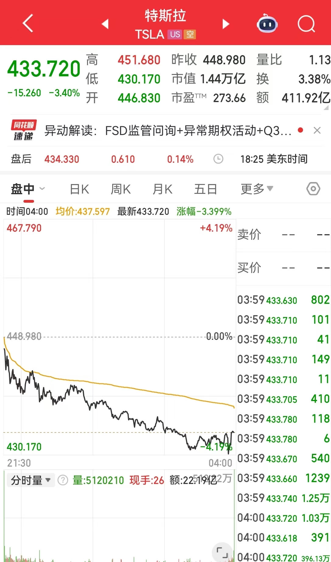 特斯拉報433.72美元,跌3.40%,市值1.44萬億美元,其市值一夜蒸發508億美元(約合人民幣3618億元)。