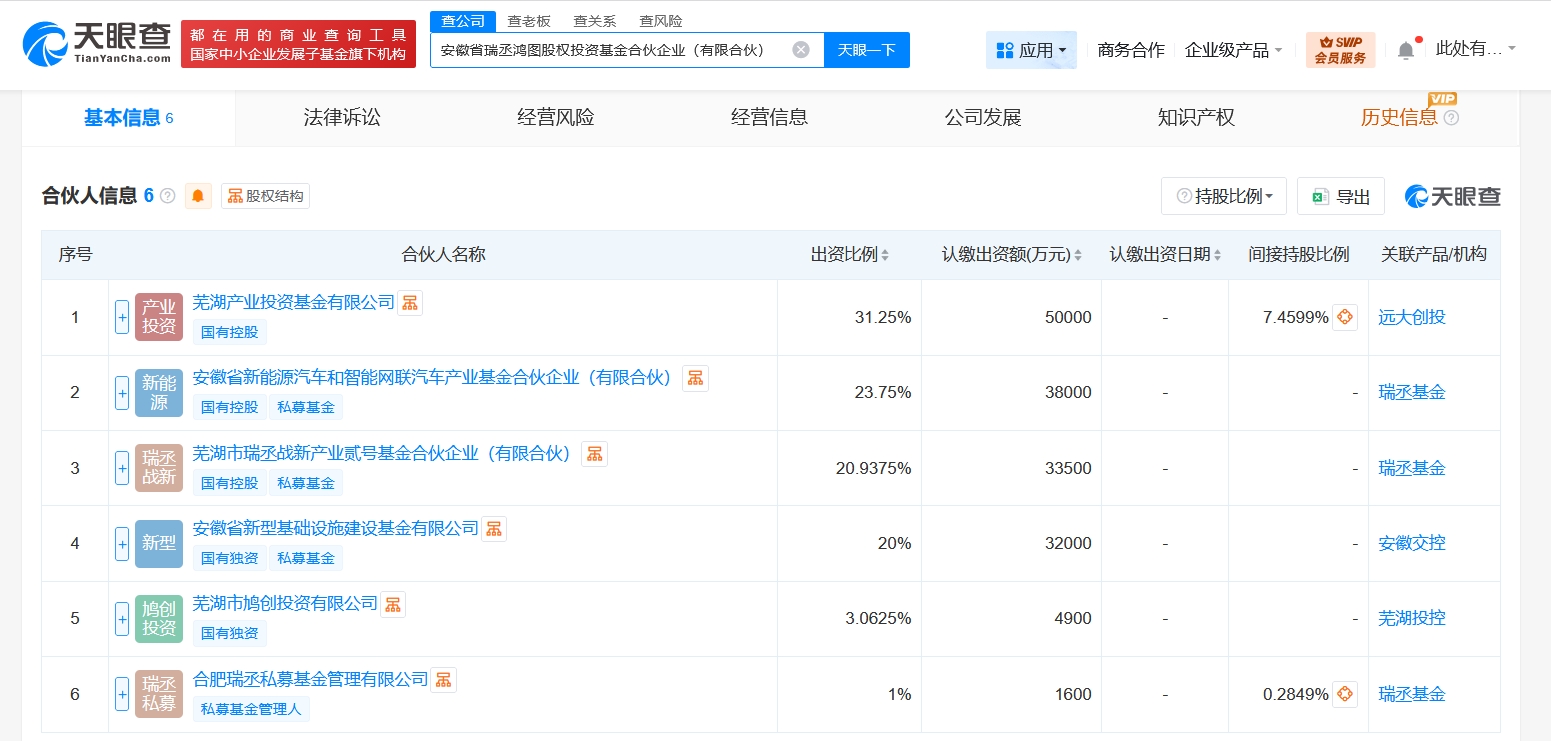 每經AI快訊,天眼查工商信息顯示,近日,安徽省瑞丞鴻圖股權投資基金合伙企業(yè)(有限合伙)成立,執(zhí)行事務合伙人為合肥瑞丞私募基金管理有限公司,出資額16億元人民幣,經營范圍為以私募基金從事股權投資、投資管理、資產管理等活動。合伙人信息顯示,該基金由蕪湖產業(yè)投資基金有限公司、安徽省新能源汽車和智能網聯(lián)汽車產業(yè)基金合伙企業(yè)(有限合伙)、蕪湖市瑞丞戰(zhàn)新產業(yè)貳號基金合伙企業(yè)(有限合伙)、安徽省新型基礎設施建設基金有限公司等共同出資。