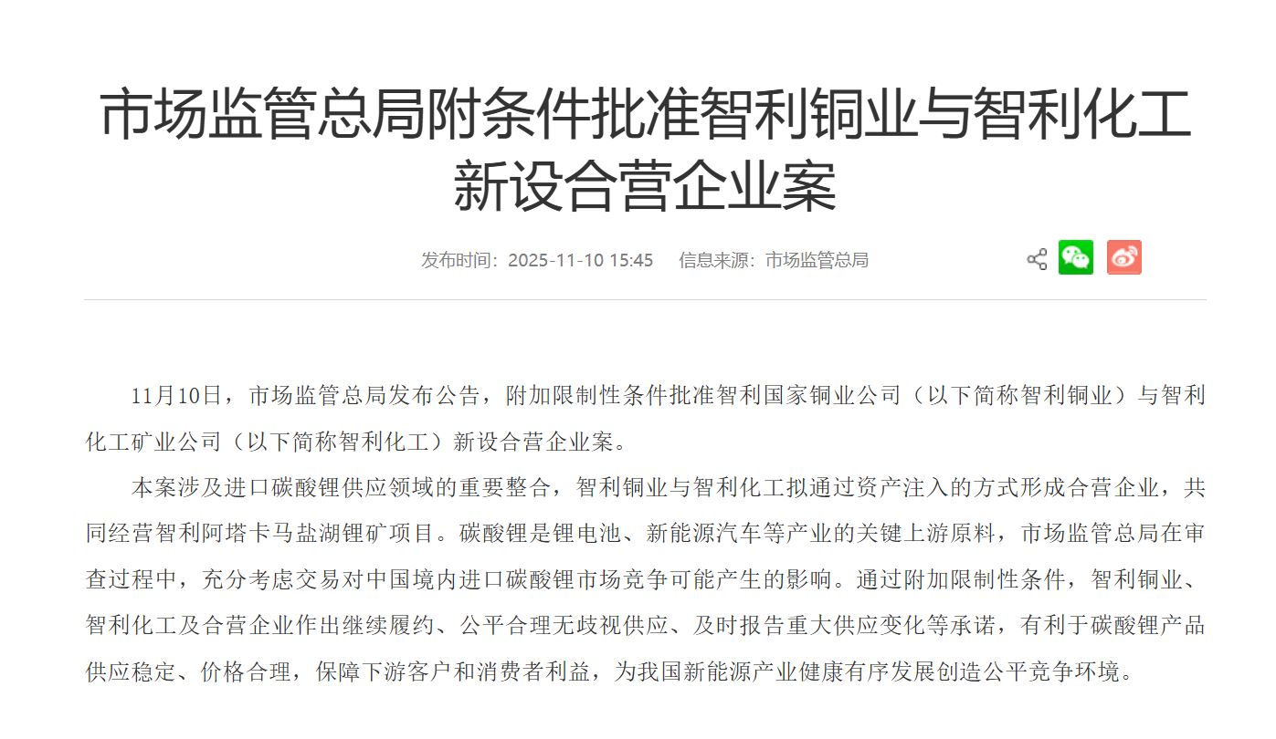 前不久,中國市場監管總局就上述“公私合營”一事進行附加限制性條件的批準。根據公告內容,碳酸鋰是鋰電池、新能源汽車等產業的關鍵上游原料,市場監管總局在審查過程中,充分考慮交易對中國境內進口碳酸鋰市場競爭可能產生的影響。通過附加限制性條件,智利銅業、智利化工及合營企業作出繼續履約、公平合理無歧視供應、及時報告重大供應變化等承諾,有利于碳酸鋰產品供應穩定、價格合理,保障下游客戶和消費者利益,為我國新能源產業健康有序發展創造公平競爭環境。