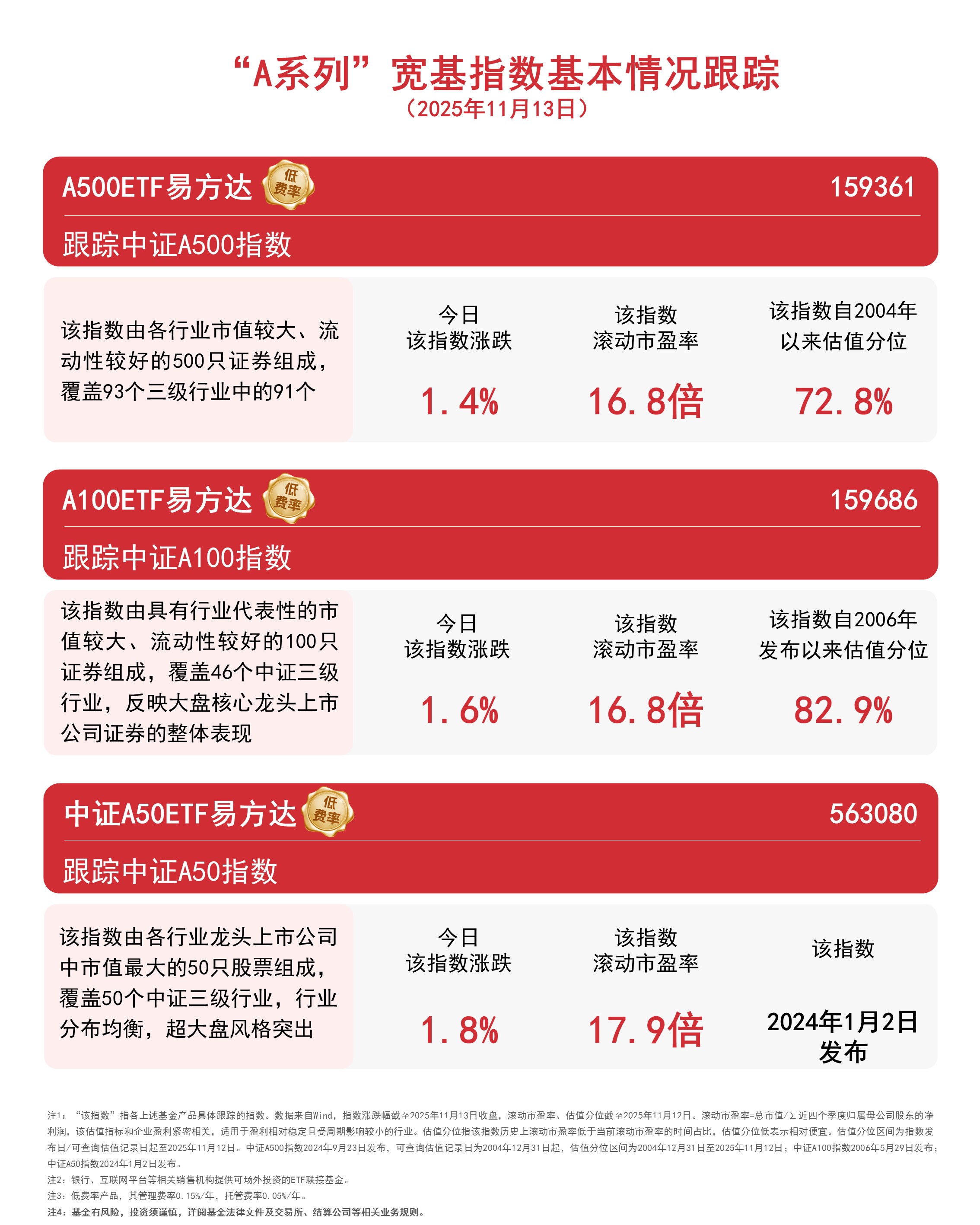 截至收盤,中證A500指數上漲1.4%,中證A100指數上漲1.6%,中證A50指數上漲1.8%,A500ETF易方達(159361)全天成交額超43億元。