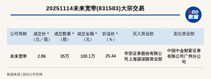 每經訊,2025年11月14日,新三板創新層公司未來寬帶(831583,收盤價:2.28元)發生一筆大宗交易,成交價2.86元/股,成交數量35萬股,成交金額100.1萬元,溢價25.44%。買入營業部是華安證券股份有限公司上海源深路營業部,賣出營業部是中國中金財富證券有限公司廣州分公司。