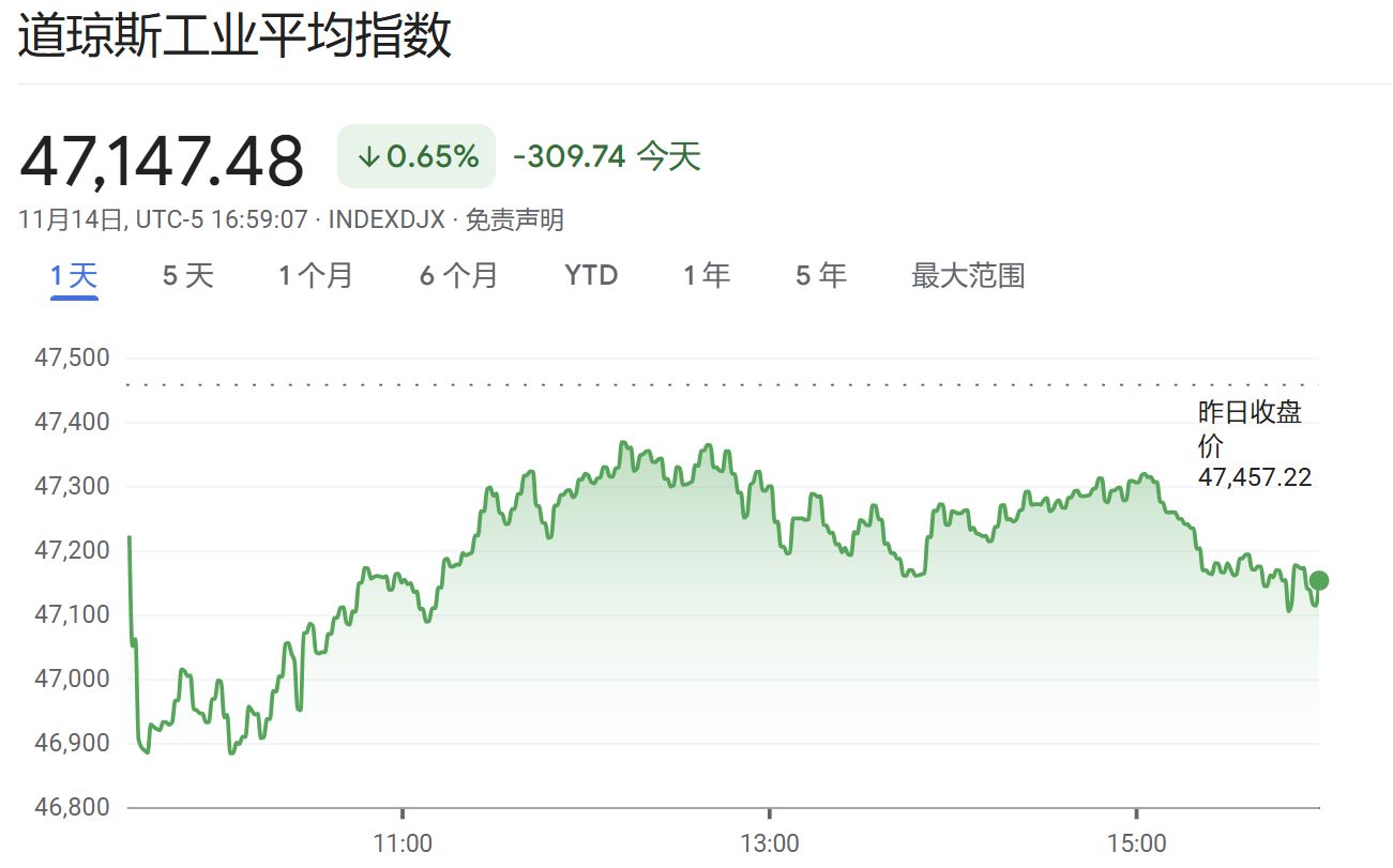 11月14日,美股上演“V型反轉(zhuǎn)”。開盤后,道指一度跌超500點,納斯達克一度跌近2%,一個多小時后,納指直線拉升,盤中轉(zhuǎn)漲,道指跌幅明顯收窄。