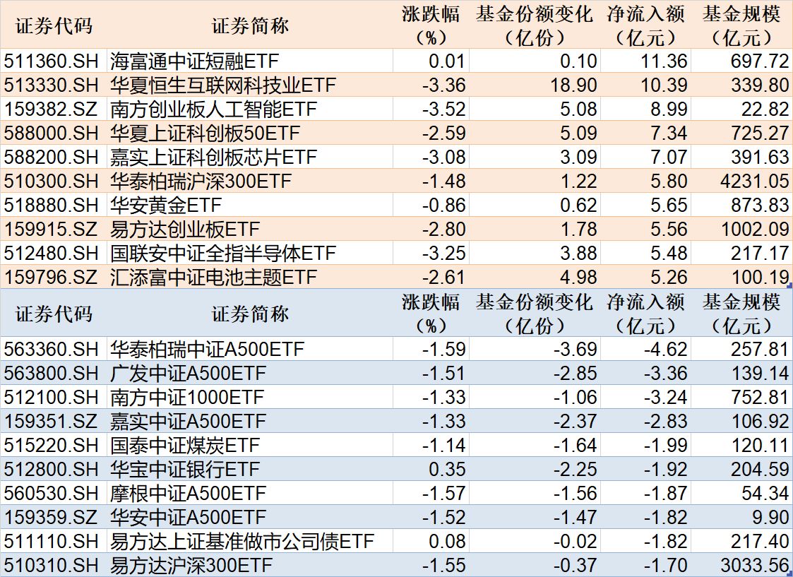 與此同時,華泰柏瑞中證A500ETF基金份額減少3.69億份,凈流出額為4.62億元;廣發中證A500ETF基金份額減少2.85億份,凈流出額為3.36億元;南方中證1000ETF基金份額減少1.06億份,凈流出額為3.24億元。