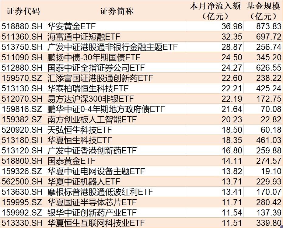 截至11月14日,本月資金凈流入額居前20的ETF名單如下: