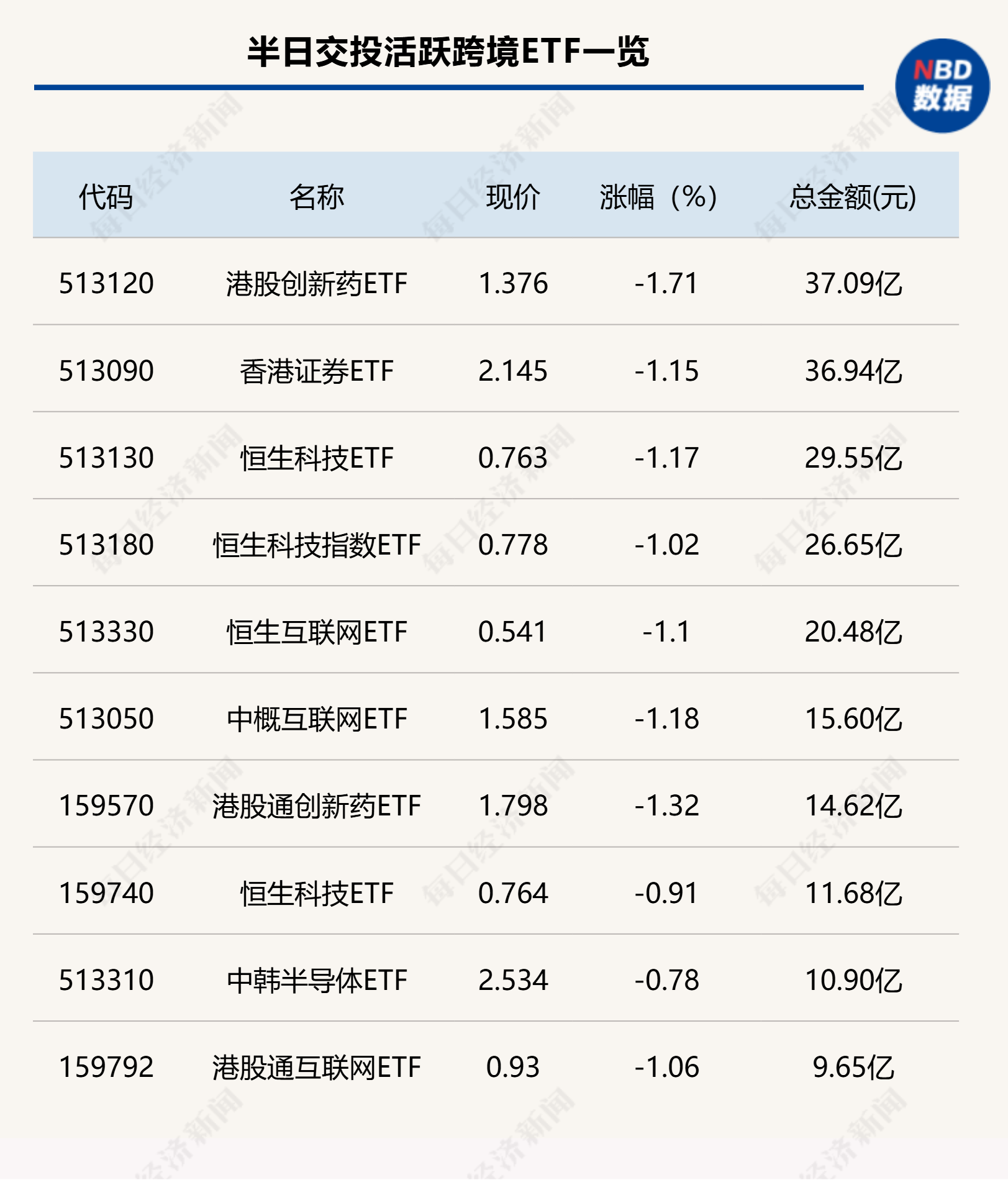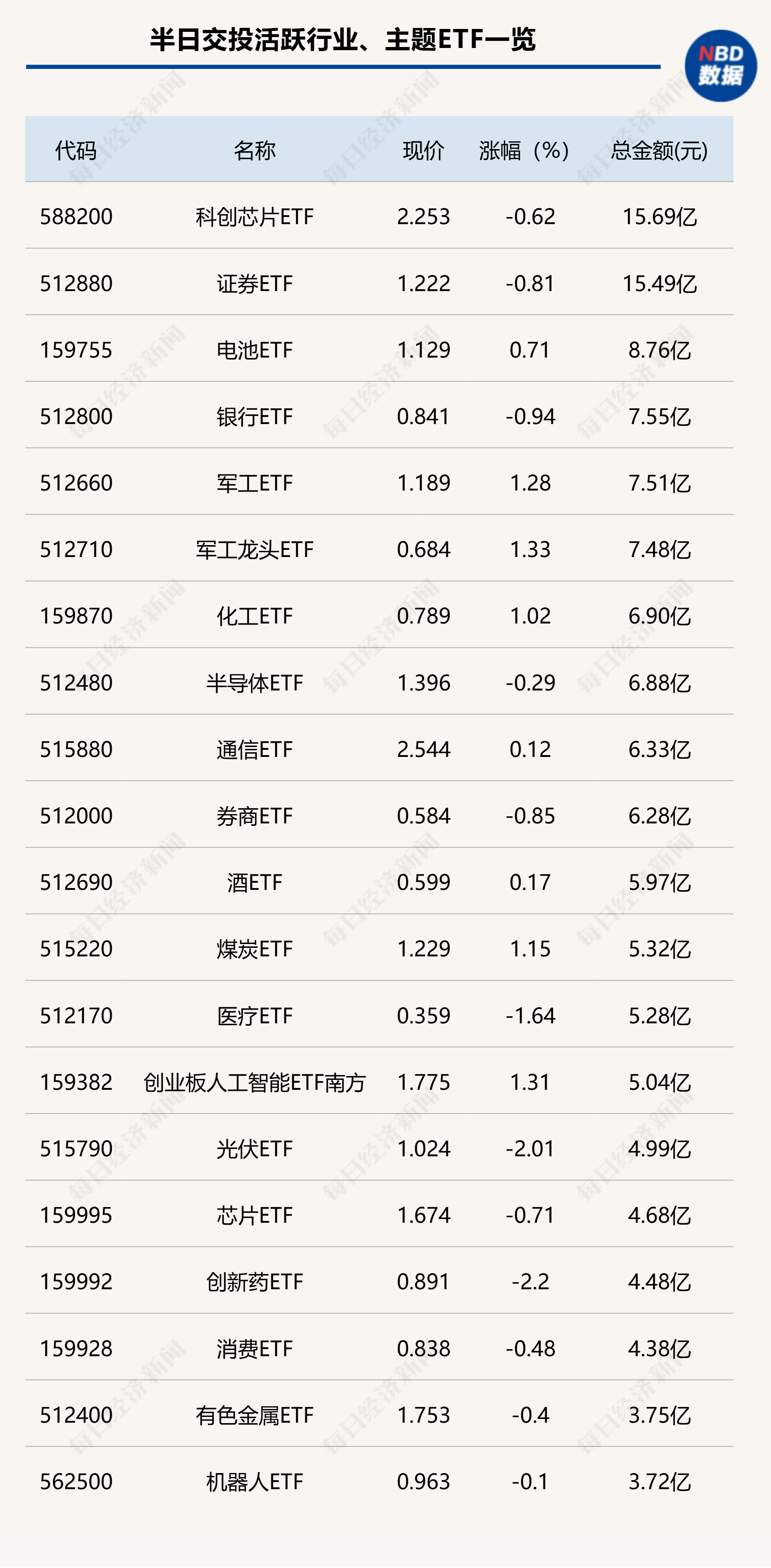 今日上午,跨境類ETF交投降溫,無一只ETF半日成交金額超過50億元,縮量明顯。行業、主題ETF方面,科創芯片ETF(588200)和證券ETF(512800)半日成交金額超15億元,交投相對活躍。