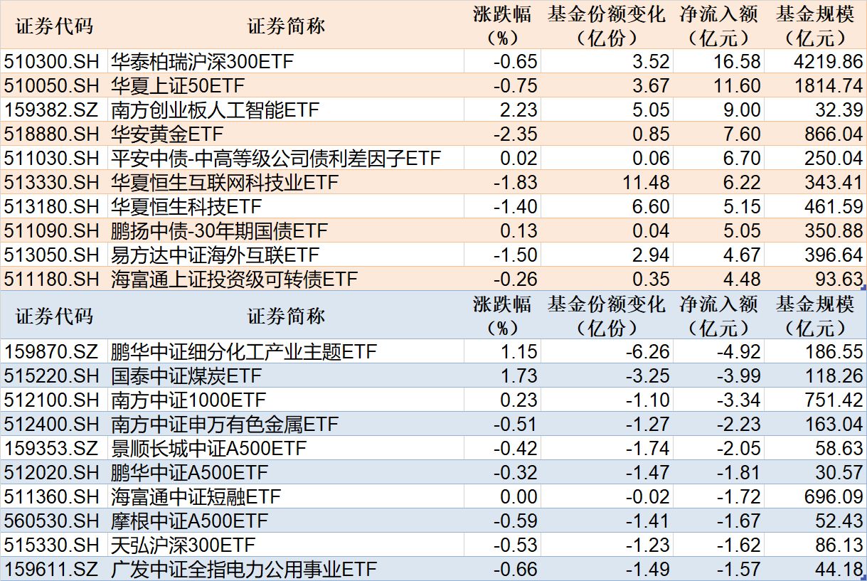 與此同時,鵬華中證細分化工產業主題ETF基金份額減少6.26億份,凈流出額為4.92億元;國泰中證煤炭ETF基金份額減少3.25億份,凈流出額為3.99億元;南方中證1000ETF基金份額減少1.10億份,凈流出額為3.34億元。