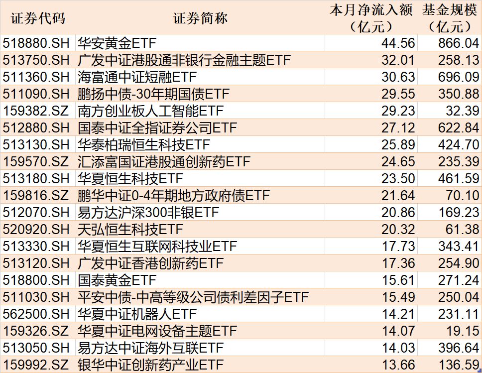 截至11月17日,本月資金凈流入額居前20的ETF名單如下: