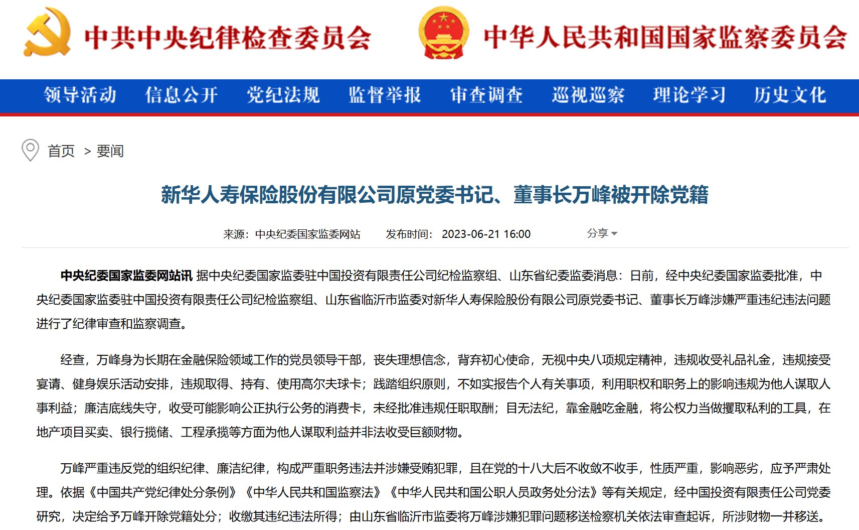 2023年6月21日,中央紀(jì)委國家監(jiān)委網(wǎng)站通報,新華人壽保險股份有限公司原黨委書記、董事長萬峰被開除黨籍。