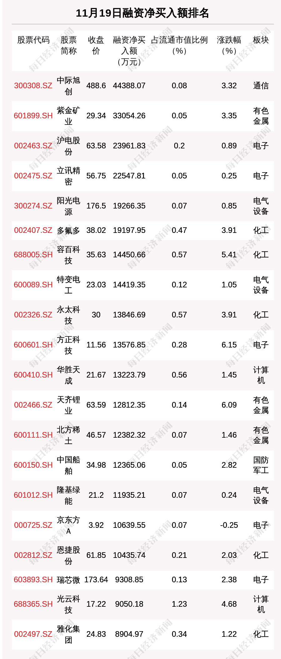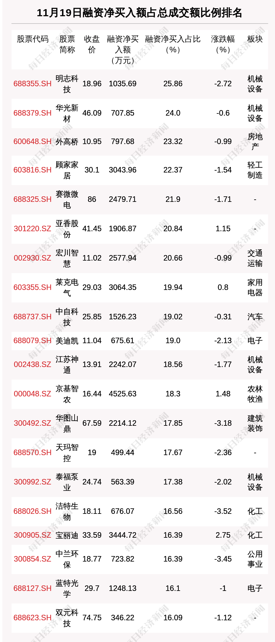 11月19日兩市共有1557只個股有融資資金凈買入。共有56只股票融資凈買入額占總成交金額比例超10%,其中明志科技、華光新材、外高橋排名前三,占比分別為25.86%、24.0%、23.32%。