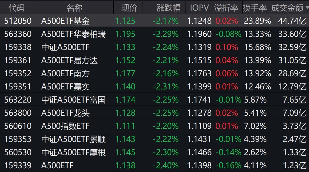 截至上午收盤,場內跟蹤中證A500指數的ETF跌超2%。其中,有12只中證A500相關ETF成交額超1億元,3只超32億元。A500ETF基金、A500ETF華泰柏瑞、中證A500ETF早盤成交額分別為44.74億元、33.6億元、32.59億元。