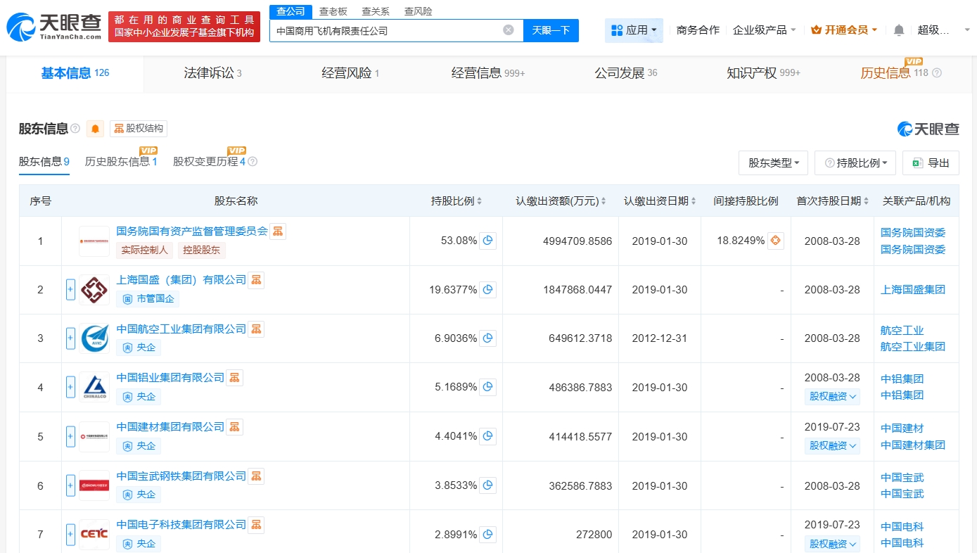 每經AI快訊,天眼查App顯示,近日,中國商用飛機有限責任公司發生工商變更,注冊資本由約501.01億元人民幣增至約940.98億元人民幣,增幅約88%。該公司成立于2008年3月,法定代表人為賀東風,經營范圍含民用飛機及相關產品設計、研制、生產、改裝、試飛、銷售、維修、服務、技術開發和咨詢服務等。股東信息顯示,該公司由國務院國有資產監督管理委員會、上海國盛(集團)有限公司、中國航空工業集團有限公司等共同持股。
