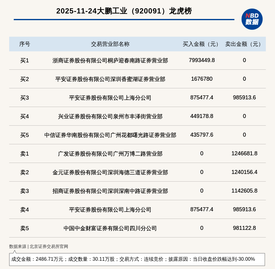 每經訊,2025年11月24日,北交所上市公司大鵬工業(920091,收盤價:82.6元)登上龍虎榜,交易方式是連續競價,披露原因是當日收盤價跌幅達到-30.00%,成交數量30.11萬股,成交金額2486.71萬元。買一席位為浙商證券股份有限公司桐廬迎春南路證券營業部,買入799.34萬元;賣一席位為廣發證券股份有限公司廣州萬博二路營業部,賣出124.67萬元。