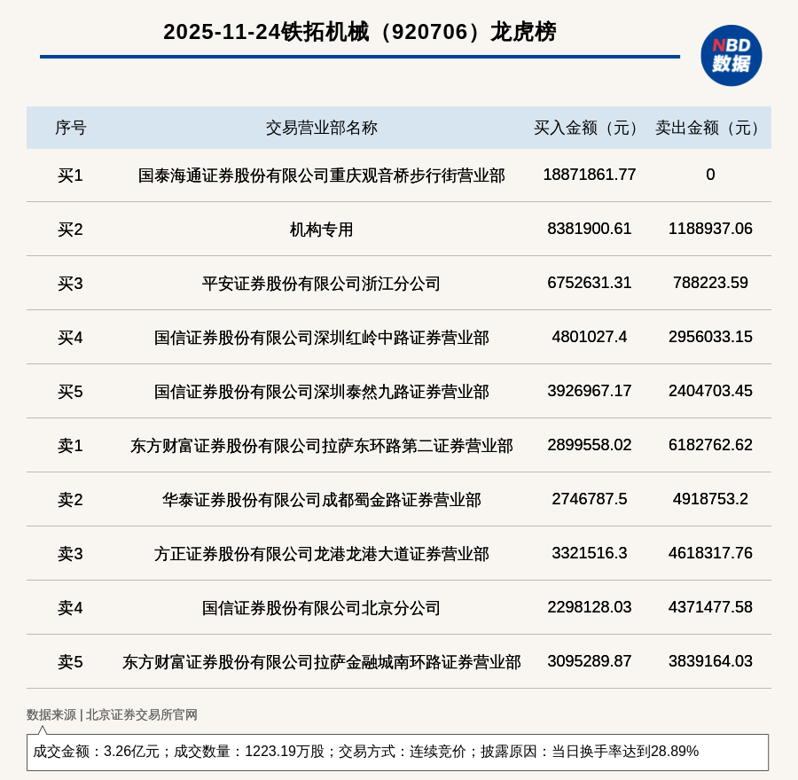 每經訊,2025年11月24日,北交所上市公司鐵拓機械(920706,收盤價:27.47元)登上龍虎榜,交易方式是連續競價,披露原因是當日換手率達到28.89%,成交數量1223.19萬股,成交金額3.26億元。買一席位為國泰海通證券股份有限公司重慶觀音橋步行街營業部,買入1887.19萬元;賣一席位為東方財富證券股份有限公司拉薩東環路第二證券營業部,賣出618.28萬元。