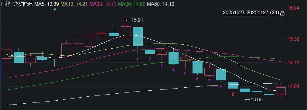 二級市場上,兗礦能源今日收盤上漲1.6%,全天成交4.37億元,換手率0.53%。值得注意的是,兗礦能源股價在11月10日盤中創下15.91元的一年新高后便開始連續下行。11月10日至11月27日收盤,兗礦能源股價在14個交易日已累計下跌9.33%。