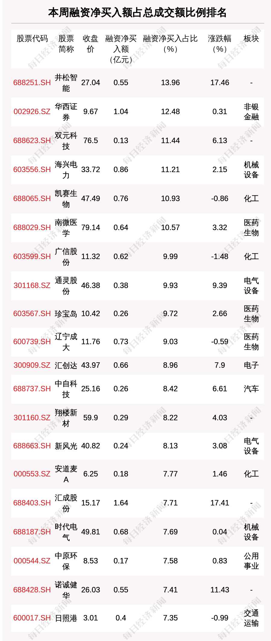 兩市共有6只股票融資凈買入額占總成交金額比例超10%。其中,井松智能、華西證券、雙元科技排名前三,占比分別為13.96%、12.48%和11.44%。