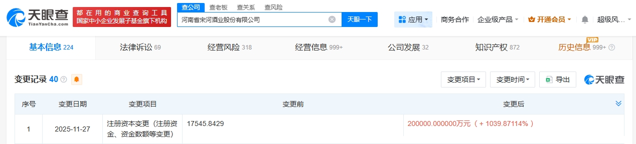 每經AI快訊,天眼查App顯示,近日,河南省宋河酒業股份有限公司發生工商變更,注冊資本由約1.75億元人民幣增至20億元人民幣,增幅約1040%。該公司成立于1999年8月,法定代表人為王水云,經營范圍包括白酒釀造、銷售等。股東信息顯示,該公司由輔仁藥業集團有限公司、嘉興和瑾春華投資合伙企業(有限合伙)、朱文臣等共同持股。