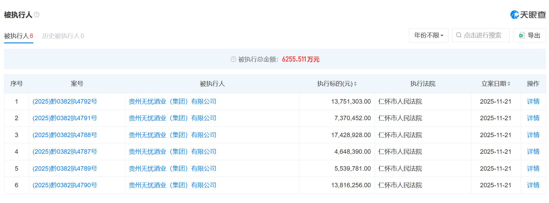 11月21日,貴州省遵義市仁懷市人民法院的6份執(zhí)行裁定書,將茅臺(tái)鎮(zhèn)知名醬酒企業(yè)——無憂酒業(yè),驟然推至行業(yè)輿論的焦點(diǎn)。據(jù)悉,公司此次被執(zhí)行總金額達(dá)6255.51萬元,這也是無憂酒業(yè)首次被列為被執(zhí)行人。