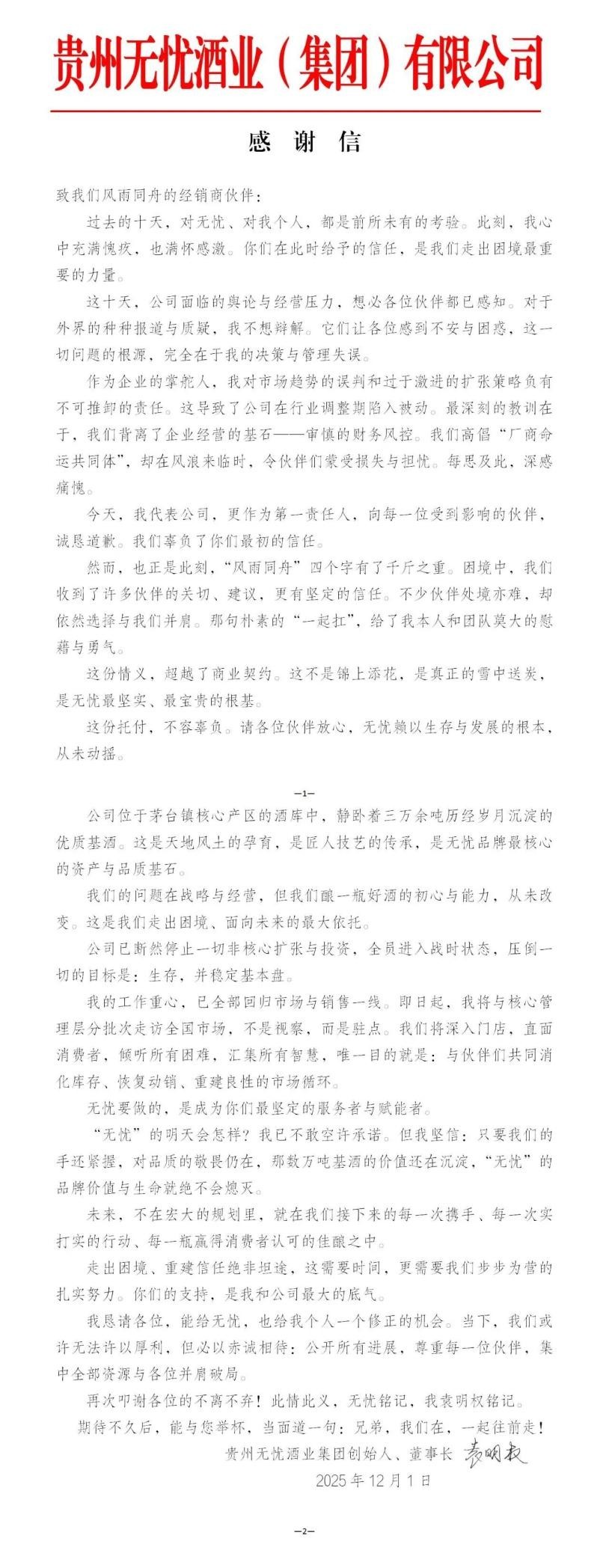 “過去的十天,對(duì)無憂、對(duì)我個(gè)人,都是前所未有的考驗(yàn)。”12月1日,貴州無憂酒業(yè)(集團(tuán))有限公司(以下簡稱“無憂酒業(yè)”)創(chuàng)始人、董事長袁明權(quán)發(fā)表致經(jīng)銷商伙伴的感謝信(以下簡稱“公開信”),并在信中向每一位受到影響的經(jīng)銷商致歉。
