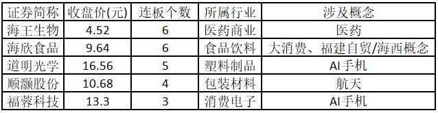 從連板情況來看,今日首板個股有37只;2連板的個股有6只;3連板及以上的個股有5只。今日連板數排名前5的個股包括海王生物、海欣食品、道明光學、順灝股份、福蓉科技,具體如下表所示。