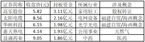 從封板資金來看,今日漲停板個股中,封板資金排名前5的個股包括高樂股份、太陽電纜、華映科技、惠天熱電、益盛藥業。歡迎大家關注微信公眾號“道達號”,其“道達漲停復盤”欄目為大家解讀。