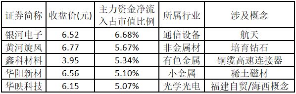 主力資金凈流入金額占市值比例排名前5的個股分別為銀河電子、黃河旋風、鑫科材料、華陽新材、華映科技。
