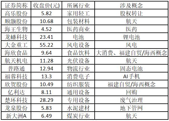 漲停板個股中,股價創出近一年新高的個股有14只(不包括創出歷史新高的個股),包括高樂股份、順灝股份、海王生物、龍蟠科技、大金重工、海欣食品、航天機電、普路通、福蓉科技、欣賀股份、億利達、楚環科技、龍泉股份、新大洲A,具體如下表所示。