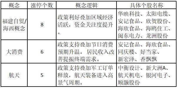 從概念特征來看,今日漲停板個股中,福建自貿/海西概念、大消費、航天概念的個股最多。