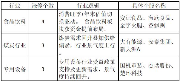 從行業特征來看,今日漲停板個股中,食品飲料、煤炭行業、專用設備行業的個股最多。