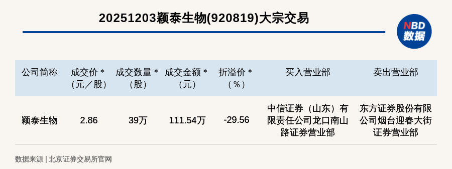 每經訊,2025年12月3日,北交所上市公司穎泰生物(920819,收盤價:4.06元)發生一筆大宗交易,成交價2.86元/股,成交數量39萬股,成交金額111.54萬元,折價29.56%。買入營業部是中信證券(山東)有限責任公司龍口南山路證券營業部,賣出營業部是東方證券股份有限公司煙臺迎春大街證券營業部。