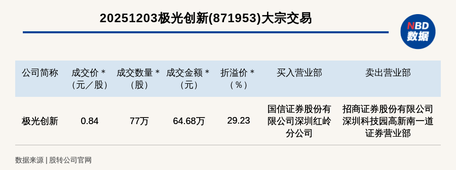 每經訊,2025年12月3日,新三板基礎層公司極光創新(871953,收盤價:0.65元)發生一筆大宗交易,成交價0.84元/股,成交數量77萬股,成交金額64.68萬元,溢價29.23%。買入營業部是國信證券股份有限公司深圳紅嶺分公司,賣出營業部是招商證券股份有限公司深圳科技園高新南一道證券營業部。