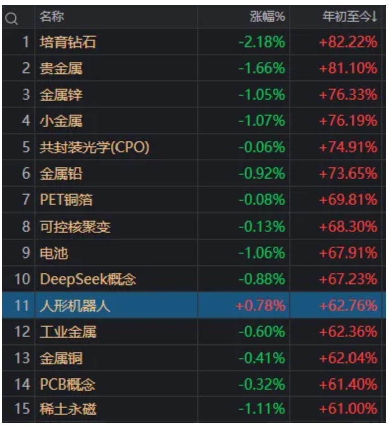 而人形機器人板塊雖然今天整體漲幅不算大,但板塊內漲停個股卻不少,因此可以說受到短線資金關注。并且在年內漲幅靠前的板塊里,人形機器人也是唯一飄紅的。