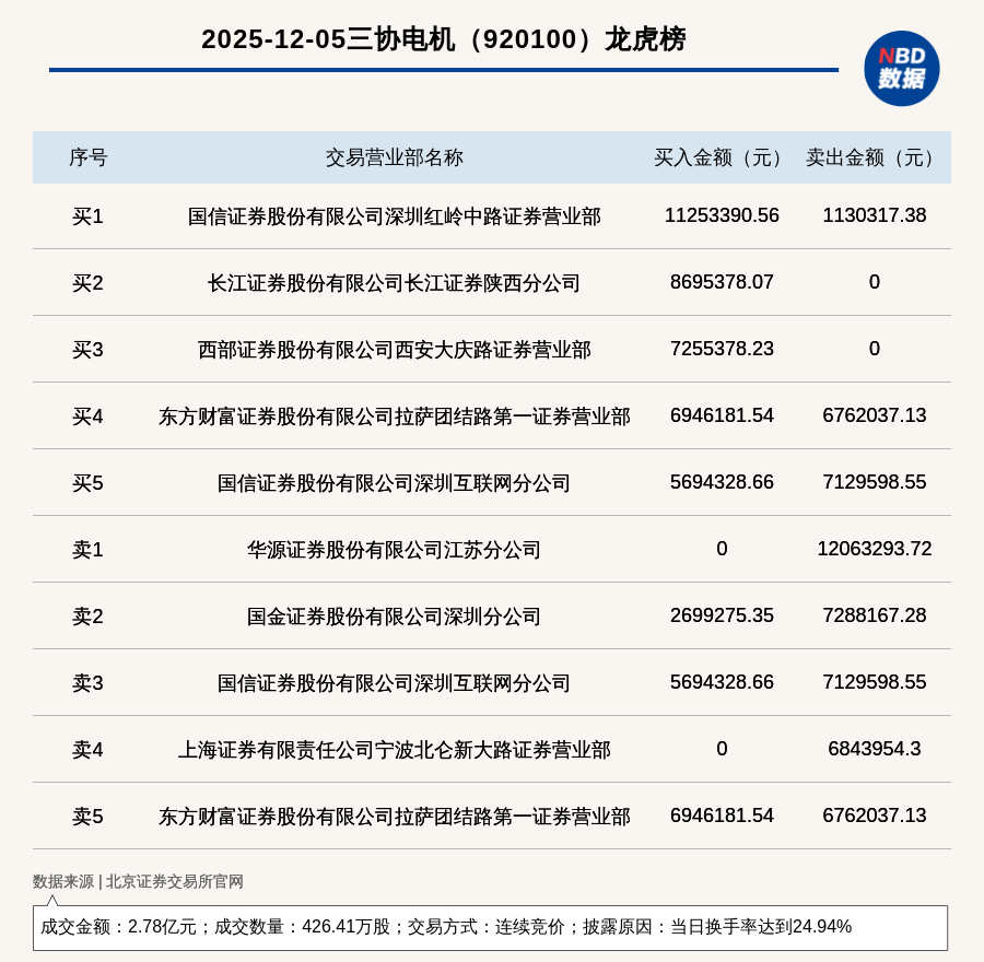 每經(jīng)訊,2025年12月5日,北交所上市公司三協(xié)電機(jī)(920100,收盤(pán)價(jià):67元)登上龍虎榜,交易方式是連續(xù)競(jìng)價(jià),披露原因是當(dāng)日換手率達(dá)到24.94%,成交數(shù)量426.41萬(wàn)股,成交金額2.78億元。買(mǎi)一席位為國(guó)信證券股份有限公司深圳紅嶺中路證券營(yíng)業(yè)部,買(mǎi)入1125.34萬(wàn)元;賣(mài)一席位為華源證券股份有限公司江蘇分公司,賣(mài)出1206.33萬(wàn)元。