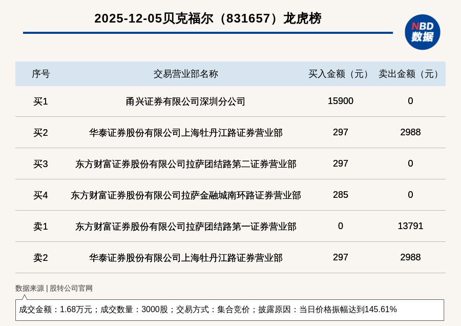 每經訊,2025年12月5日,新三板創新層公司貝克福爾(831657,收盤價:7元)登上龍虎榜,交易方式是集合競價,披露原因是當日價格振幅達到145.61%,成交數量3000股,成交金額1.68萬元。買一席位為甬興證券有限公司深圳分公司,買入1.59萬元;賣一席位為東方財富證券股份有限公司拉薩團結路第一證券營業部,賣出1.38萬元。