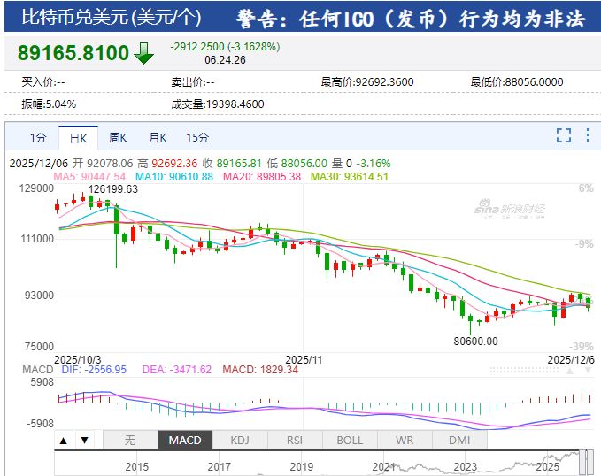 比特幣再次跌穿9萬美元關口。截至發稿報89165.81美元,跌幅3.16%。
