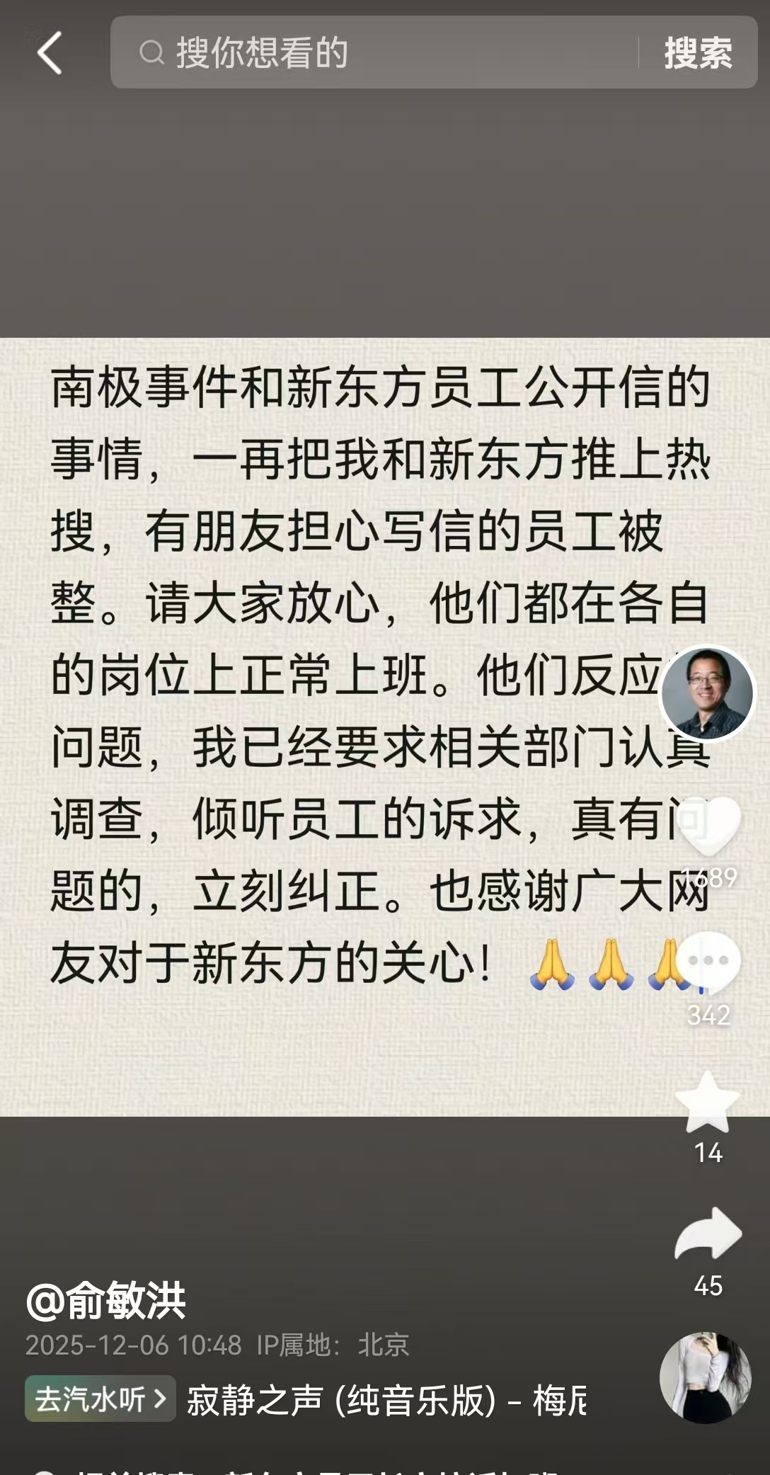 12月6日,新東方集團董事長俞敏洪發(fā)文稱,南極事件和新東方員工公開信的事情,一再把我和新東方推上熱搜,有朋友擔心寫信的員工被整。請大家放心,他們都在各自的崗位上正常上班。他們反映的問題,我已經(jīng)要求相關(guān)部門認真調(diào)查,傾聽員工的訴求,真有問題的,立刻糾正。