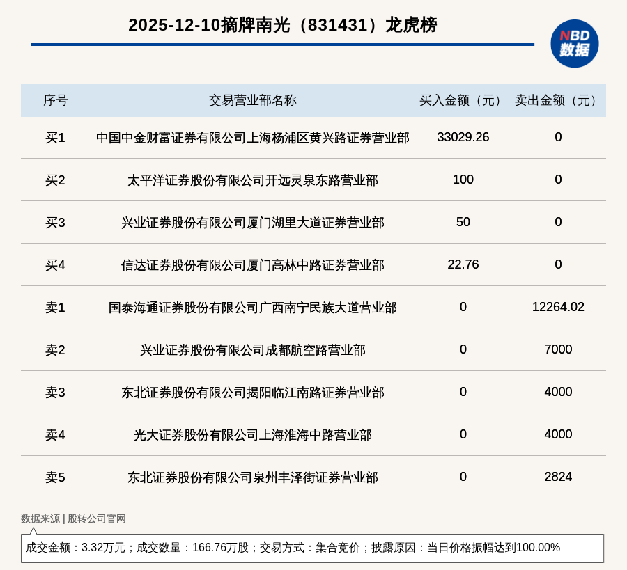 每經訊,2025年12月10日,新三板基礎層公司摘牌南光(831431,收盤價:0.02元)登上龍虎榜,交易方式是集合競價,披露原因是當日價格振幅達到100.00%,成交數量166.76萬股,成交金額3.32萬元。買一席位為中國中金財富證券有限公司上海楊浦區黃興路證券營業部,買入3.3萬元;賣一席位為國泰海通證券股份有限公司廣西南寧民族大道營業部,賣出1.23萬元。