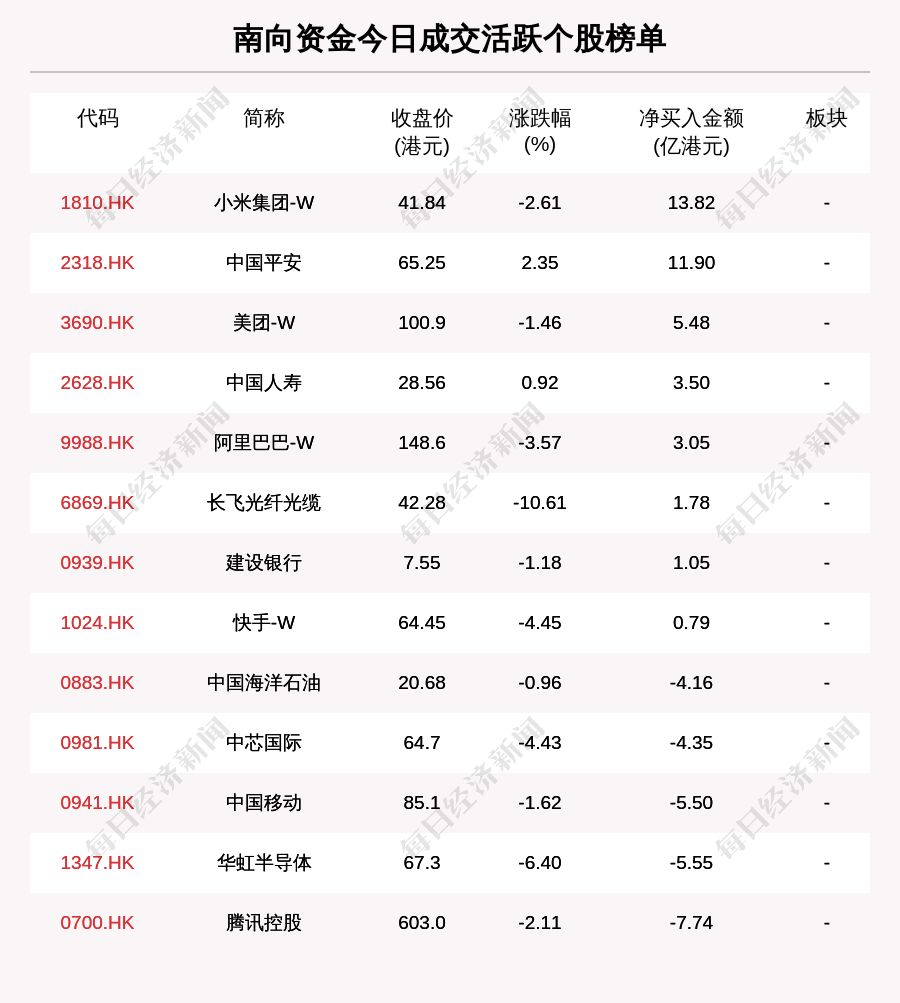 南向資金成交活躍個股榜單中,凈買入個股共8只,金額最多的是小米集團-W(1810.HK,收盤價:41.84港元),凈買入13.819億港元;凈賣出個股共5只,金額最多的是騰訊控股(0700.HK,收盤價:603.0港元),凈賣出7.741億港元。