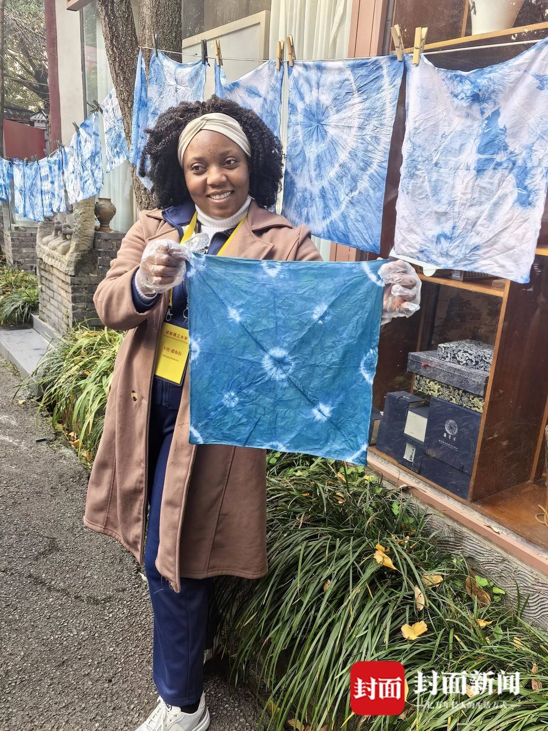 “可以提起來看看啦!”隨著工作人員的提示,留學生們小心翼翼地拉起布料,解開棉線和夾子的瞬間,驚喜接連不斷——有的是錯落有致的菱形花紋,像灑滿夜空的星辰;有的是層層疊疊的暈染效果,宛如川西煙雨朦朧的景致;還有的因纏繞力度不同,形成了獨一無二的抽象紋路。