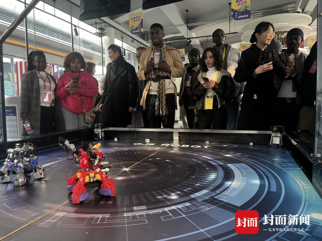 機器人體驗館內更是熱鬧非凡。會作揖會跳躍,還會賣萌的機器狗,跟著音樂節拍扭動身軀跳“廣場舞”的人形機器人,讓留學生們忍俊不禁。性格外向的他們圍上前去,或伸手與機器狗互動,或跟著機器人的舞步模仿動作,館內滿是歡聲笑語。機器人對壘臺前,四川農業大學加蓬留學生李安德和伙伴們手持遙控器,操控著機器人展開“PK”,金屬碰撞的清脆聲響與圍觀者的陣陣喝彩聲交織在一起;一旁的糖畫機器人正精準勾勒出卡通圖案,自動咖啡機一鍵出品香醇咖啡,讓女生們頻頻發出“哇”的贊嘆,指尖不停按下拍照鍵。