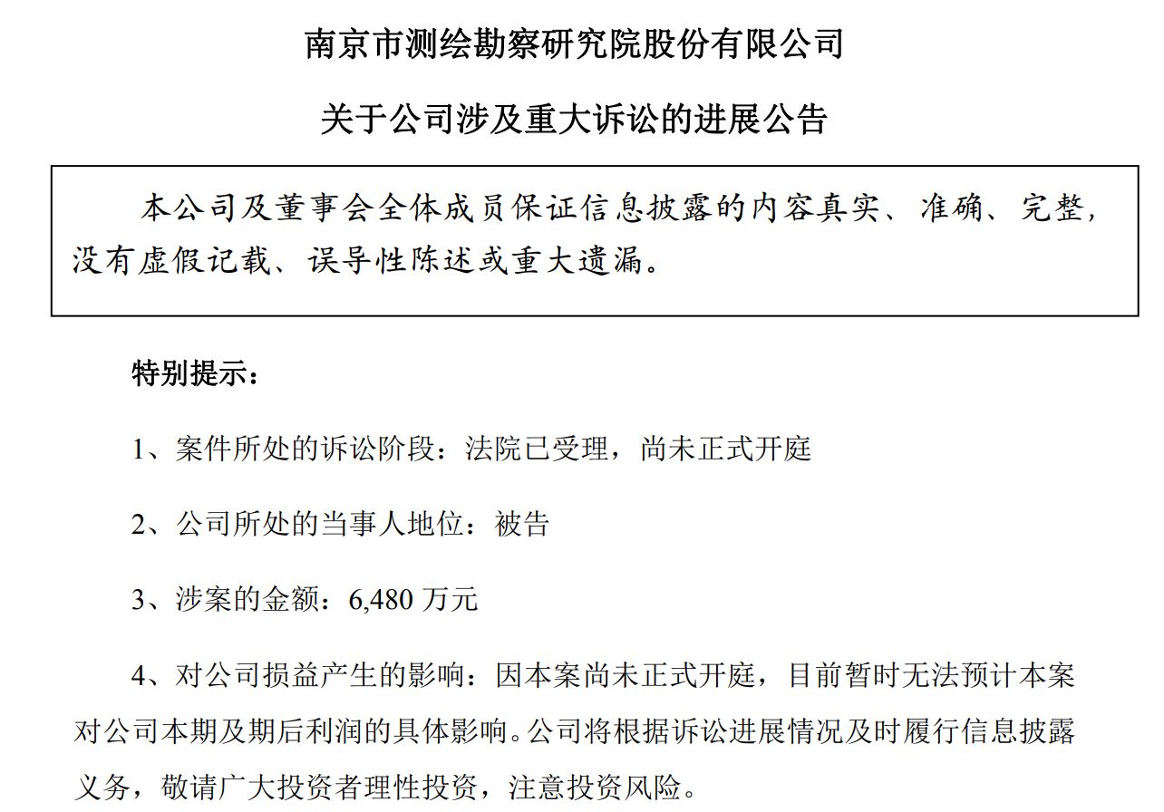因本案尚未正式開庭,測繪股份在公告中表示,目前暫時無法預計本案對公司本期及期后利潤的具體影響。