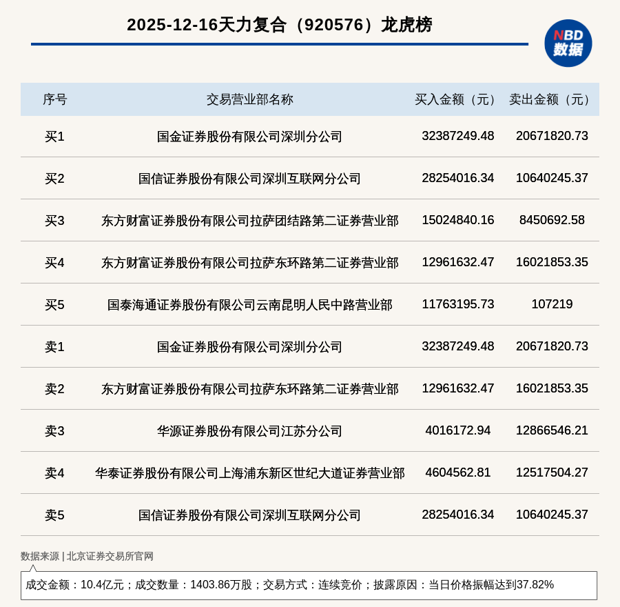 每經訊,2025年12月16日,北交所上市公司天力復合(920576,收盤價:81.88元)登上龍虎榜,交易方式是連續競價,披露原因是當日價格振幅達到37.82%,成交數量1403.86萬股,成交金額10.4億元。買一席位為國金證券股份有限公司深圳分公司,買入3238.72萬元;賣一席位為國金證券股份有限公司深圳分公司,賣出2067.18萬元。