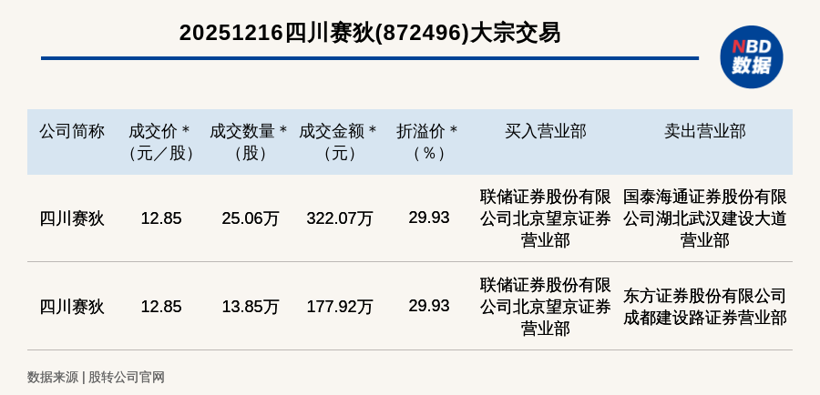 每經訊,2025年12月16日,新三板創新層公司四川賽狄(872496,收盤價:9.89元)發生2筆大宗交易,總成交金額為500萬元,成交金額最高的一筆成交價12.85元/股,成交數量25.06萬股,成交金額322.07萬元,溢價29.93%。買入營業部是聯儲證券股份有限公司北京望京證券營業部,賣出營業部是國泰海通證券股份有限公司湖北武漢建設大道營業部。
