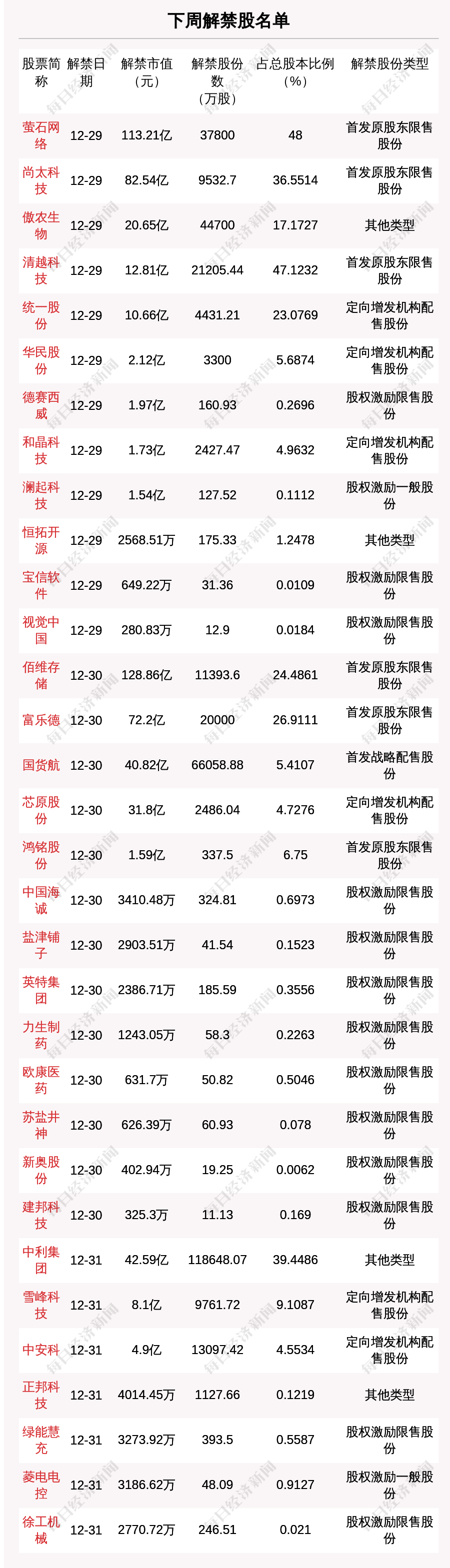 每經(jīng)AI快訊,下周(12月29日至1月4日)一共有32家公司36.83億股限售股解禁,解禁市值為580.97億元,環(huán)比減少1332.3億元。