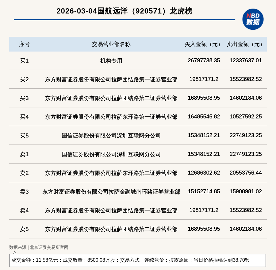 每經(jīng)訊,2026年3月4日,北交所上市公司國航遠(yuǎn)洋(920571,收盤價:13.5元)登上龍虎榜,交易方式是連續(xù)競價,披露原因是當(dāng)日價格振幅達(dá)到38.70%,成交數(shù)量8500.08萬股,成交金額11.58億元。買一席位為機(jī)構(gòu)專用,買入2679.77萬元;賣一席位為國信證券股份有限公司深圳互聯(lián)網(wǎng)分公司,賣出2274.91萬元。
