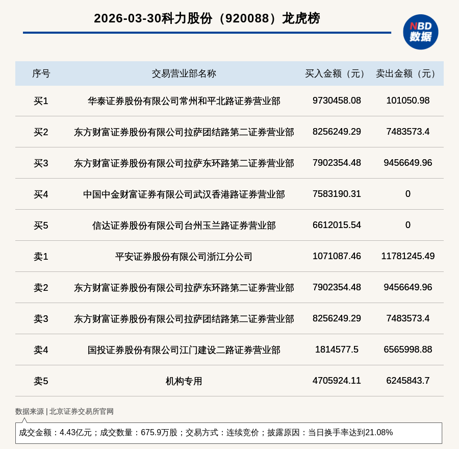 每經訊,2026年3月30日,北交所上市公司科力股份(920088,收盤價:63.42元)登上龍虎榜,交易方式是連續競價,披露原因是當日換手率達到21.08%,成交數量675.9萬股,成交金額4.43億元。買一席位為華泰證券股份有限公司常州和平北路證券營業部,買入973.05萬元;賣一席位為平安證券股份有限公司浙江分公司,賣出1178.12萬元。