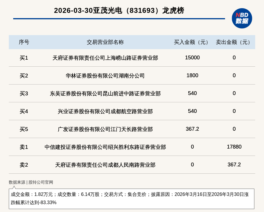每經(jīng)訊,2026年3月30日,新三板基礎(chǔ)層公司亞茂光電(831693,收盤價:0.15元)登上龍虎榜,交易方式是集合競價,披露原因是2026年3月16日至2026年3月30日漲跌幅累計達(dá)到-83.33%,成交數(shù)量6.14萬股,成交金額1.82萬元。買一席位為天府證券有限責(zé)任公司上海嶗山路證券營業(yè)部,買入1.5萬元;賣一席位為中信建投證券股份有限公司紹興勝利東路證券營業(yè)部,賣出1.79萬元。