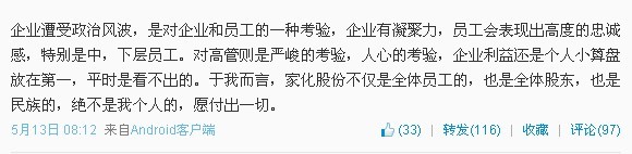 昨日(5月13日)上午,葛文耀發的一條微博稱,企業正遭受一場風波,“是對企業和員工的一種考驗……于我而言,家化股份不僅是全體員工的,也是全體股東,也是民族的,絕不是我個人的,愿付出一切。”