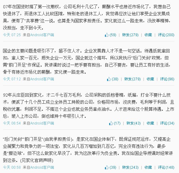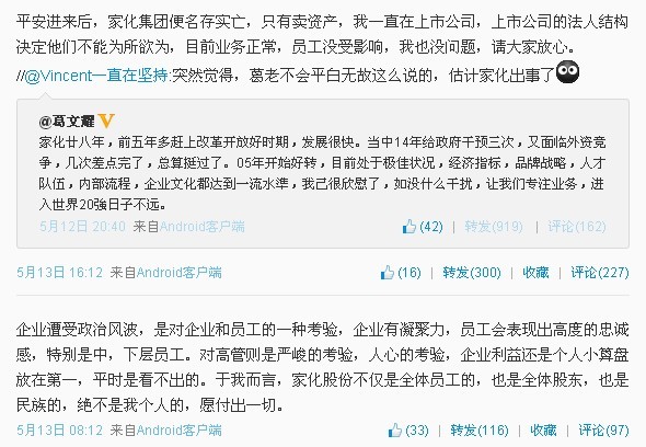 昨日下午,葛文耀發的另一條微博中,將矛頭直指大股東平安集團:“平安進來后,家化集團便名存實亡,只有賣資產,我一直在上市公司,上市公司的法人結構決定他們不能為所欲為……”
